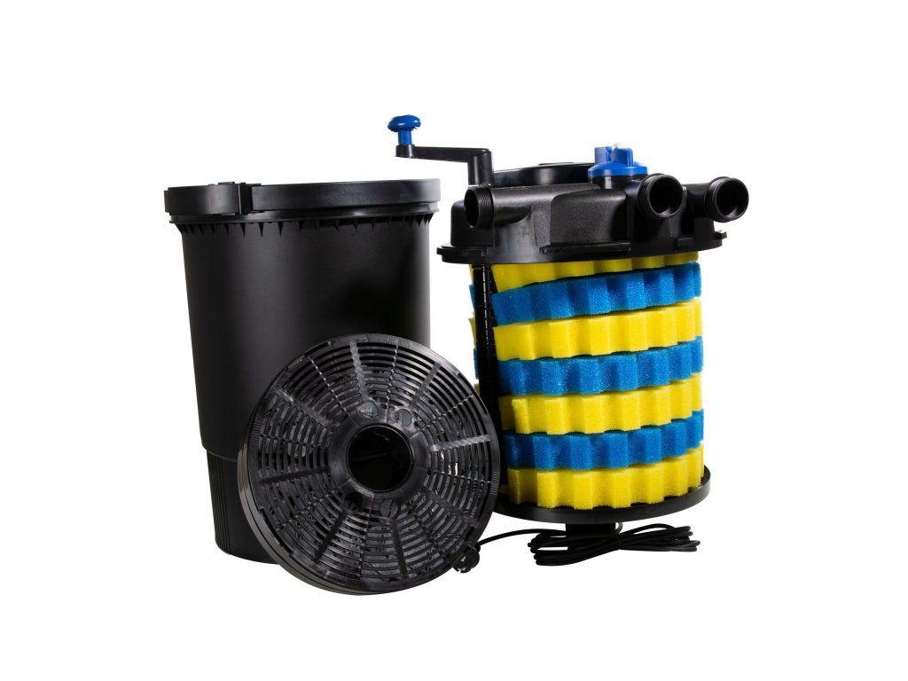 - Účinná filtrace jde skrze speciální filtrační materiály, jako je žlutá a modrá houba s různými rychlostmi průchodu vody, která mají velký povrch a to umožňuje osídlení bakteriemi. Tento filtr navíc obsahuje bio kuličky tzv. "Bio-balls", které poskytují další prostor pro osídlení bakteriemi a navíc prokysličují vodu. Filtrační média jsou součásti balení.