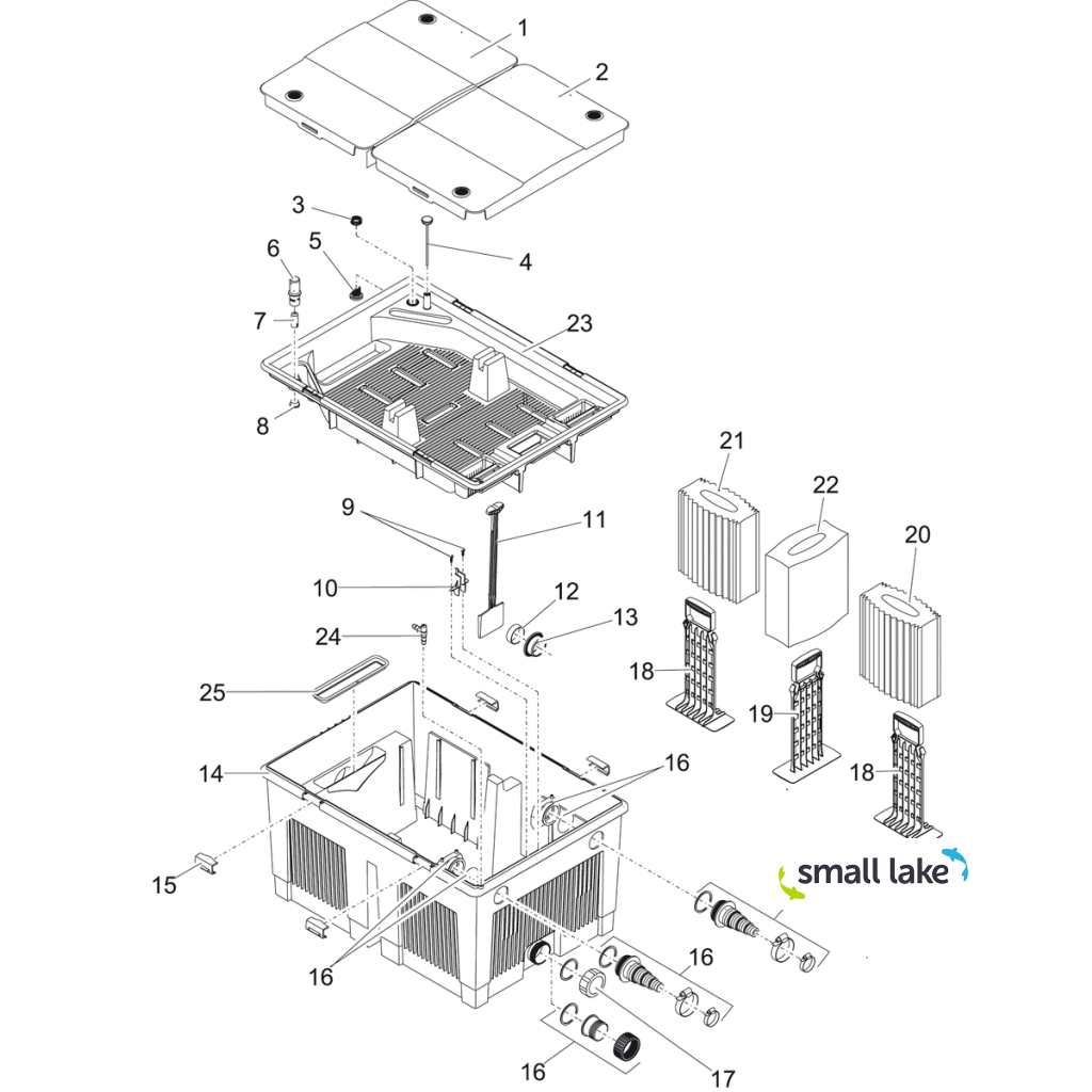 Vysoce výkonný mechanicko-biologický průtokový filtr s více komorami. Ve všech jezírkových filtrech Biotec jsou použity speciální filtrační materiály k efektivnímu biologickému čištění.