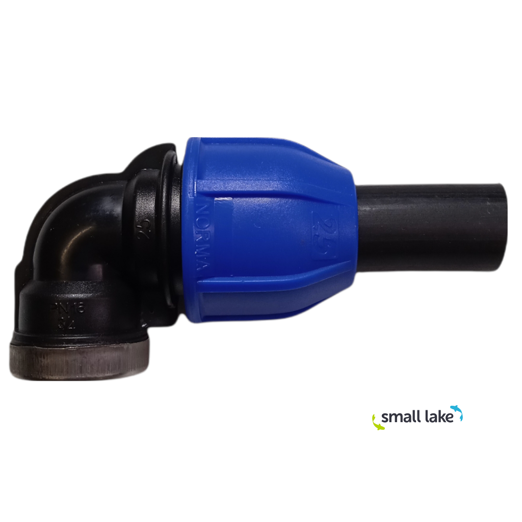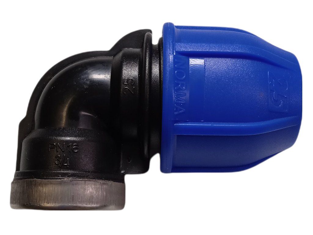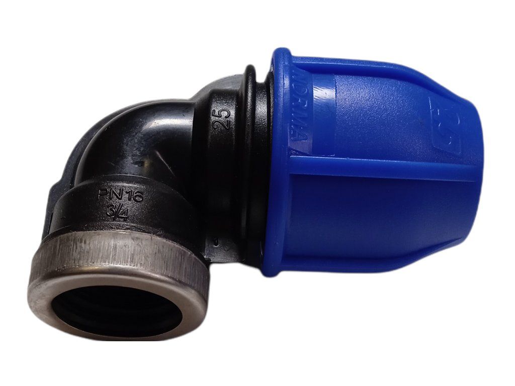 Koleno PE 25 × 3/4" s vnitřním závitem je mechanická (kompresní) tvarovka určená pro bezpečné a rychlé napojení PE potrubí na závitové armatury při současné změně směru potrubí. Typicky se používá tam, kde potřebujete vyvést rozvod do rohu nebo k armatuře a přejít z potrubí Ø 25 mm na standardní závit 3/4" (vnitřní) například k ventilům, filtrům, rozvodným prvkům nebo dalším závitovým komponentům.