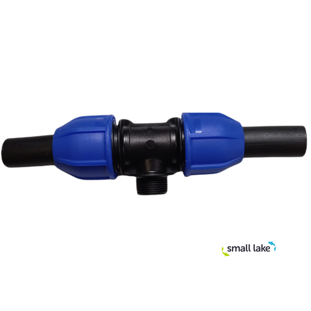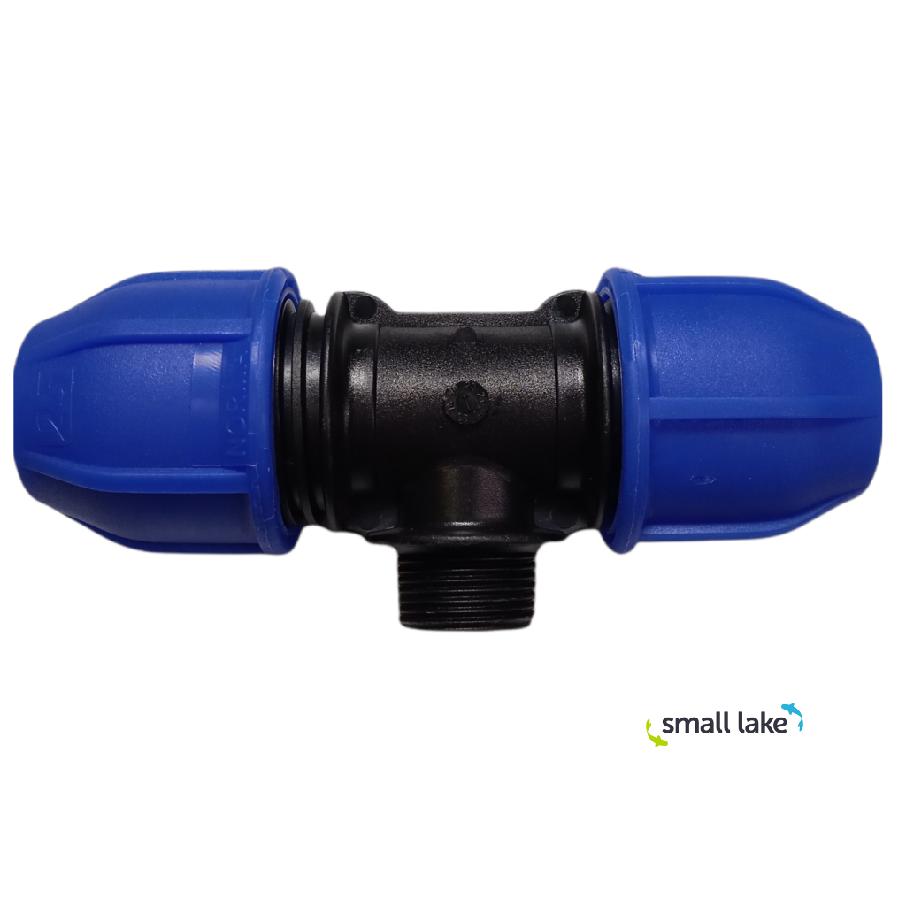 T‑kus PE 25 × 3/4" vnější × 25 je mechanická (kompresní) tvarovka určená pro spolehlivé spojování polyetylenového potrubí a vytvoření závitové odbočky v jednom kroku. Na průběžné větvi připojíte PE potrubí Ø 25 mm a na odbočce získáte standardní 3/4" vnější závit, na který snadno našroubujete běžné armatury a komponenty (např. kulový ventil, filtr, redukci, rozdělovač nebo přechod na jiný typ rozvodu).
