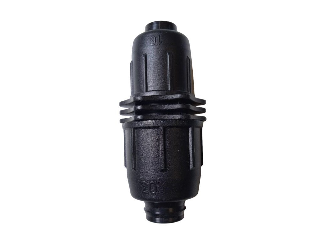 PP redukce s převlečnou maticí 20 × 16 mm (Quick Joint) je praktická tvarovka pro propojení hlavního rozvodu s menšími větvemi (například přechod z LDPE potrubí 20 mm na kapkovou hadici 16 mm).