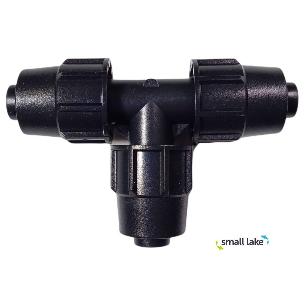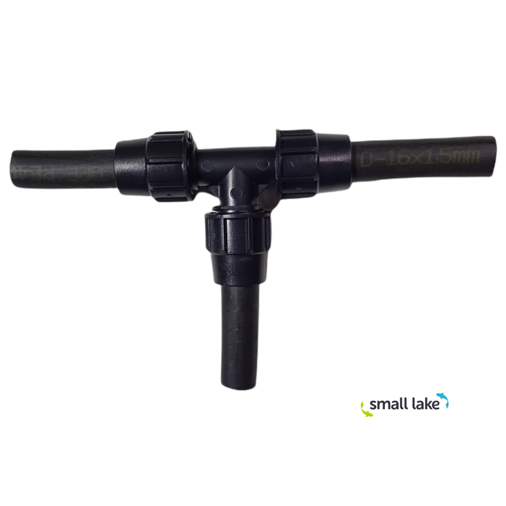 Velmi kvalitní T-kus s převlečnými maticemi pro 16mm kapkové potrubí.