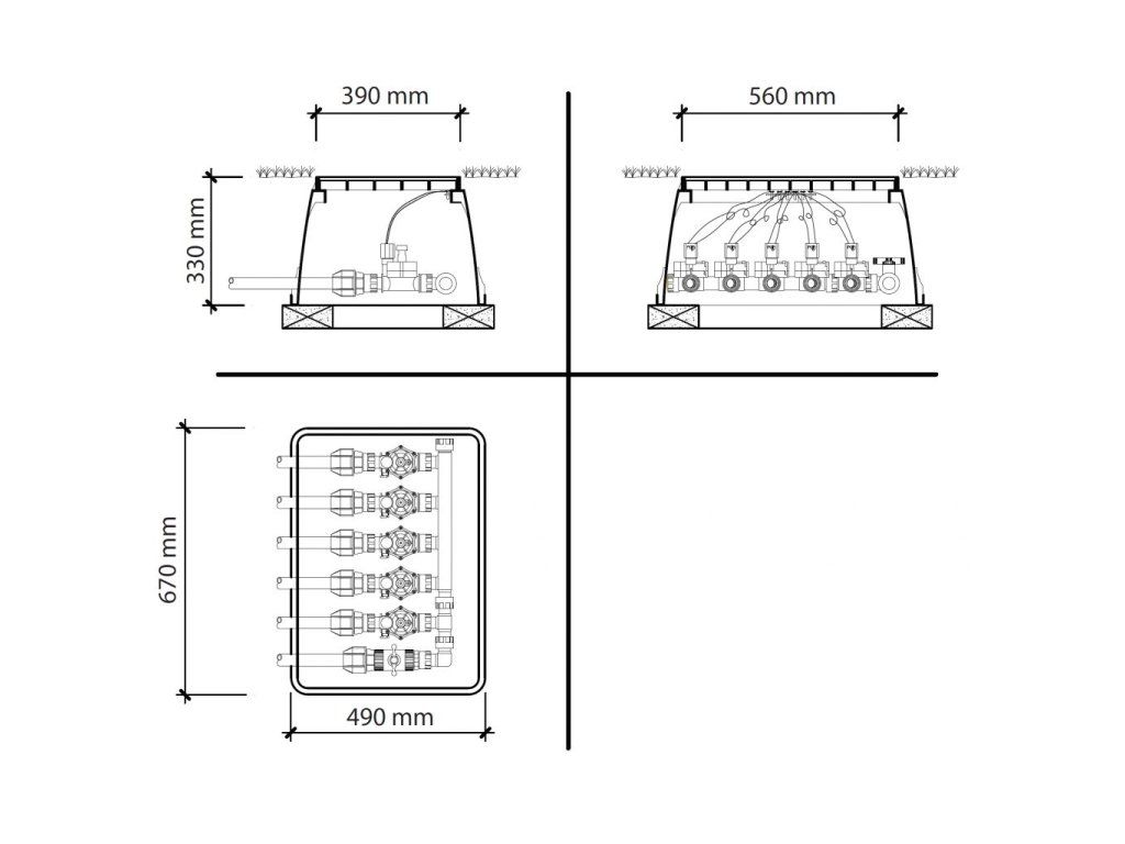 Ventilová šachta JUMBO slouží k ochraně důležitých prvků automatického závlahového systému umístěných pod zemí – nejčastěji elektromagnetických ventilů nebo mechanických kulových ventilů. Zároveň vymezuje manipulační prostor tak, aby byl přístup k ventilům přehledný a servis (kontrola, oprava, výměna, zazimování) šel udělat rychle a bez zbytečného rozkopávání okolí.