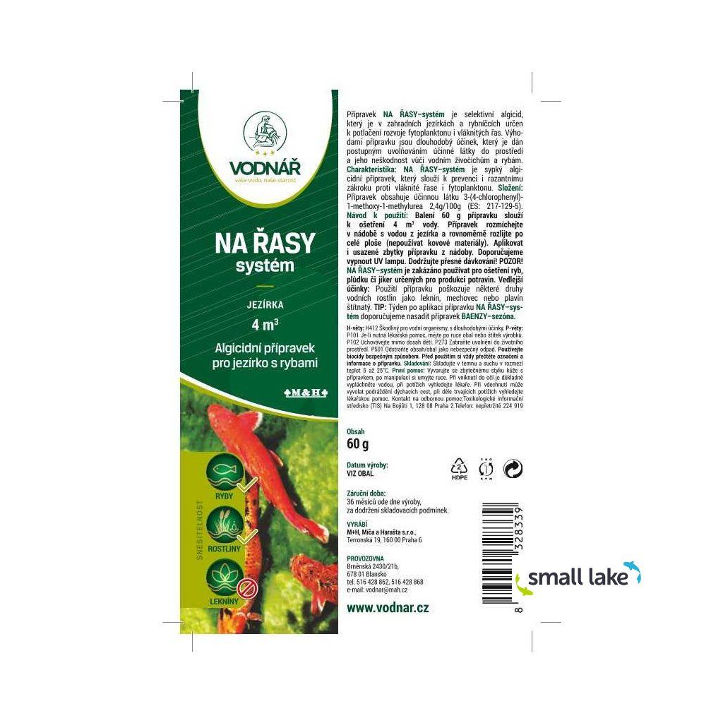 Vodnář SYSTÉM jezírka je sypký přípravek určený k likvidaci přemnožených řas a sinic (tzv. zelené vody) v zahradních jezírkách a rybníčcích s okrasnými rybami. Pomáhá rychle vyčistit vodu, potlačuje opětovný růst řas a zároveň pozitivně ovlivňuje ekosystém jezírka, čímž zlepšuje životní podmínky pro ryby.