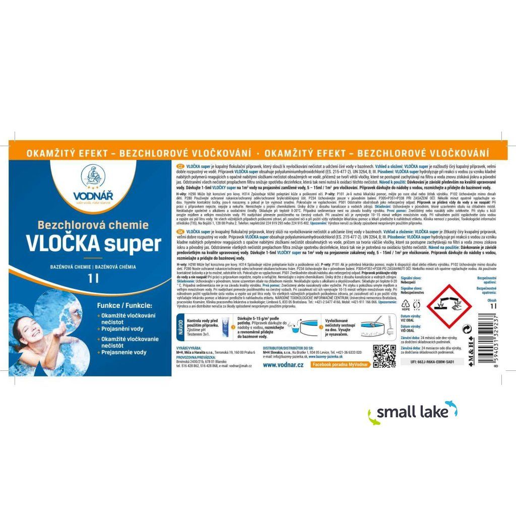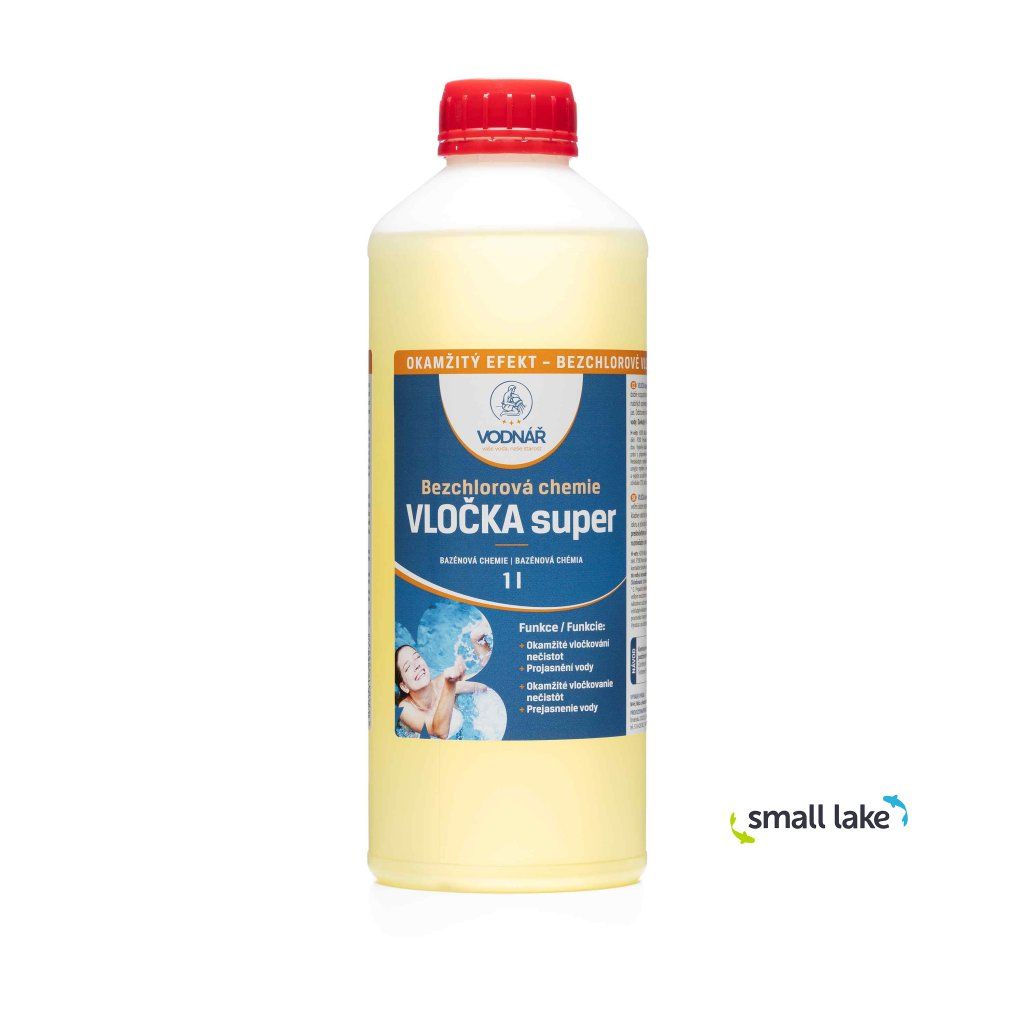 Vodnář Vločka Super je vysoce účinný tekutý vločkovač určený k rychlému projasnění zakalené bazénové vody a odstranění jemných nečistot. Po aplikaci se ve vodě tvoří kladně nabité polymery, které vážou drobné částice, řasy a organické nečistoty do větších vloček. Tyto vločky se následně snadno zachytí ve filtru nebo usadí na dně bazénu, odkud je lze odstranit vysavačem.